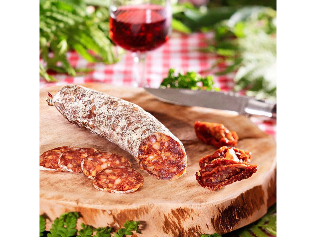 Vepřové maso, vepřová střeva, sůl, laktóza, sušená rajčata, dextróza, aromata, česnek, koření, enzymy, konzervanty E252, E250.