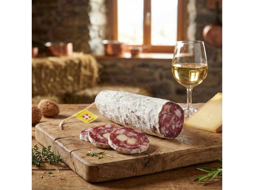 Příběh chuti: Základem je poctivé, hruběji mleté francouzské vepřové maso a hřbetní sádlo, které zajišťuje šťavnatost. To pravé kouzlo se však odehrává díky pomalému procesu sušení v přírodním střívku. Na povrchu kvete typická stříbřitě-šedá ušlechtilá plíseň – pečeť kvality, která masu dodává nezaměnitelné aroma lesních hub a ořechů. Uvnitř se pak skrývají kousky sýra Beaufort (Chráněné označení původu). Tento horský sýr se v klobáse nerozplyne úplně, ale vytvoří delikátní, polotuhé ostrůvky, které při skusu uvolní intenzivní, ovocno-květinovou chuť a jemnou slanost. Je to rustikální, syté a neuvěřitelně návykové.